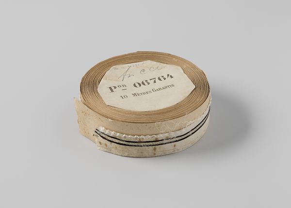 Editor: This is a photograph from between 1890 and 1935, housed at the Rijksmuseum, entitled "Lint op rol, wit satijn met in het midden een streep ajourwerk gevat tussen twee strepen zwart, één zijde is geschulpt en afgezet met een golvende rand in wit," which appears to be a roll of ribbon, carefully arranged and photographed. What draws your eye to this seemingly simple object? Curator: The photograph's stark presentation interests me. We see an object meant for embellishment—ribbon— isolated and offered to the viewer, almost as raw material. Think about the social context; what would a photograph of ribbon, packaged like this, signify to someone at the turn of the century, compared to today? Editor: It seems very utilitarian, doesn't it? Practical and… perhaps aimed at consumers who sew? Curator: Exactly! The “10 metres garantis” suggests an emphasis on standardized production and consumer trust, reflecting the rise of industrial manufacturing. But also, examine the craft evident in the ribbon itself— the satin, the ajour work. Doesn't it speak to a tension between handmade and mass-produced goods, where even a product of industry aims to evoke quality and artistry? How does that contrast with mass production today? Editor: That's a fascinating point. So the photograph isn't just showing us a ribbon; it is capturing a specific moment in consumer culture and modes of production? Curator: Precisely! It encourages us to consider how even everyday objects carry layers of meaning related to labor, materials, and systems of commerce. Editor: I see. This has definitely opened my eyes to thinking more deeply about what materials tell us! Curator: Excellent. It's these everyday objects that reflect our society's values, processes, and our relationships with production and consumption.