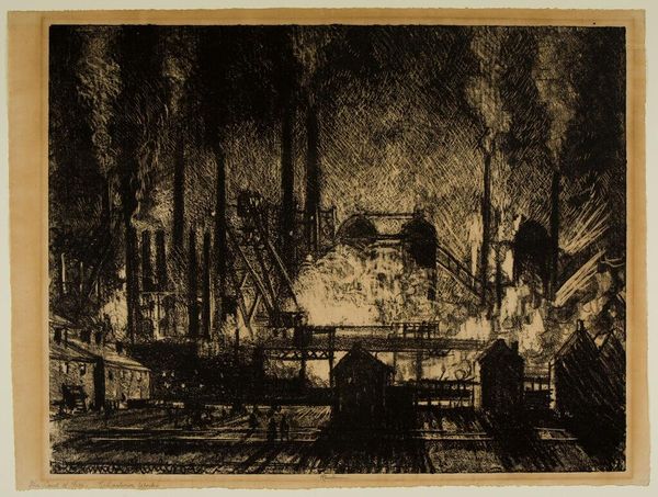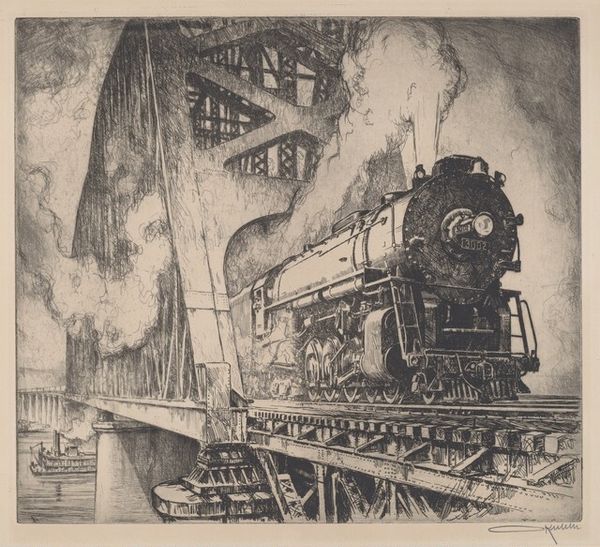 Otto August Kühler made this print, "The Panting Brute," and well, it's like he's wrestling with this huge, mechanical beast, right? The brute itself is this massive train, rendered through these intricate, almost frantic lines. It's all hatching and cross-hatching, creating this dense, dark texture that feels almost sculptural. Look closely and you can see how the light catches on the curves of the engine, thanks to the varying pressure of the tool on the plate. What I find so interesting is how Kühler doesn't shy away from the grit and grime of it all. The smoke billows, the metal groans, and the workers seem dwarfed by the sheer scale of the machine. It reminds me a little of Joseph Pennell’s industrial scenes, this fascination with the raw power of industry, but Kühler’s got a more visceral, emotional edge. It's less about celebration, more about confrontation. It is that struggle that makes this piece so compelling, this sense of humanity grappling with the forces it has unleashed.