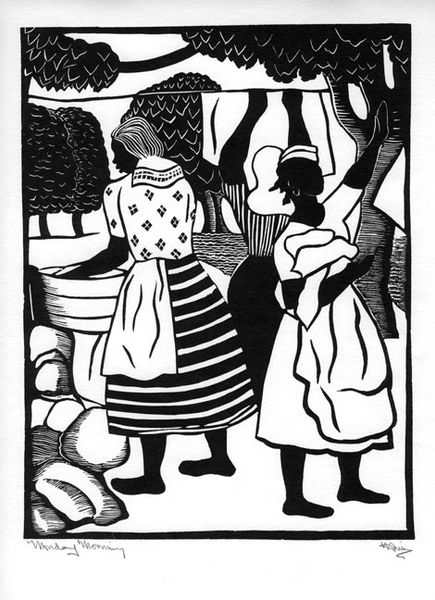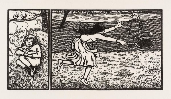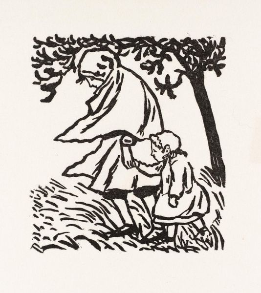 Editor: Here we have Lucien Pissarro's "Floréal," a small but striking wood engraving. I'm immediately drawn to the composition—the figures beneath the blossoming tree. What strikes you most about its visual elements? Curator: The stark contrast between the black ink and the white paper creates a compelling visual tension. Observe how the dense, intricate linework of the tree canopy contrasts with the smoother surfaces of the figures' clothing. How does this interplay of textures affect your perception of depth? Editor: It almost flattens the image, pushing the figures forward. I also see the title below the image and the scene above. Curator: Precisely. And note the title itself, "Floréal," a month in the French Republican Calendar associated with blossoming. Do you perceive a connection between the title, the depicted imagery, and Pissarro’s aesthetic choices? Editor: I do! It adds another layer to the work, connecting form and concept. Thank you. Curator: Indeed, a fruitful observation connecting textual and visual elements.