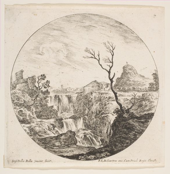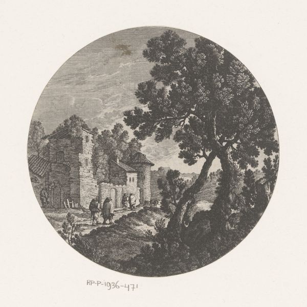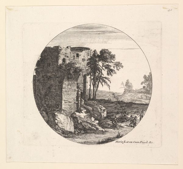 Editor: Jean Morin's "Les Ruines au Fond," dating from roughly 1605 to 1650, rendered in engraving. There's a definite feeling of melancholy, with this circular frame enclosing crumbling architecture and a lone figure. What strikes you most about this piece? Curator: What I see is a visual commentary on the passage of time and the instability of power. Ruins, particularly those of grand structures, were potent symbols in 17th-century Europe. They spoke to the transience of earthly empires, reminding viewers of the fate of even the most powerful civilizations. Consider Rome, for example; a constant reminder in plain sight, it could make people question absolutism or hereditary privilege. Editor: So, the setting isn’t just background; it's making a statement? Curator: Precisely! And think about the social context in which prints like these circulated. They were relatively accessible. They served as tools to disseminate ideas about history, memory, and political commentary to a wider audience. Do you notice how the single figure emphasizes the grandeur of what has been lost? Editor: I see what you mean! The figure almost becomes a stand-in for the viewer, contemplating the scene and, therefore, the implied political and social message. What would such pieces achieve? Curator: Perhaps inspire reflection, question the existing power structures or express nostalgia for a more glorious past, especially if those former societies had less absolute forms of control than the commissioner. It highlights how art could be both aesthetically pleasing and subtly subversive. Editor: I hadn't considered how engravings played such a vital role in circulating political ideas, and using something as common as ruins makes such an interesting case for it! Curator: Exactly, and this kind of perspective helps us consider what role the museum should play today.