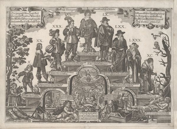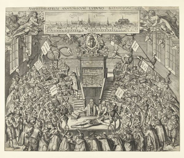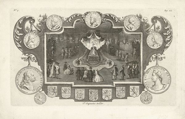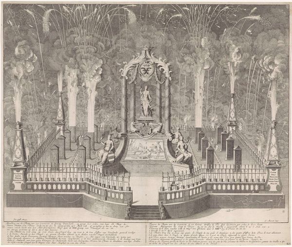 Curator: Daniel Marot’s etching, “Fireworks Celebrating the Victory at Vigo, 1702,” made between 1702 and 1704, depicts a meticulously designed spectacle. It's currently held here at the Rijksmuseum. What are your first impressions? Editor: Chaos. It's like trying to contain a tempest on paper. The fireworks are rendered as explosions of furious energy. I am instantly struck by the medium, by the etcher’s line as a form of labour – and it’s dizzying in its sheer density. Curator: It's a record of a public performance, an orchestration of gunpowder and light, yet etched for a more lasting, if smaller, public. Marot was deeply involved in the design of courtly spectacle; one can imagine the societal pressure on artists and printmakers to visually amplify moments like the Battle of Vigo Bay. Editor: The engraving process itself emphasizes labour and reproducibility – it makes you wonder about the cost of the materials – the metal, ink, and paper, as well as the value attributed to this act of immortalization by printmaking? The pomp is undercut slightly by this feeling; it's mass-produced propaganda on some level. Curator: Propaganda, celebration, commemoration… these were all entangled. Consider the central structure, adorned with allegorical figures. It anchors the ephemeral fireworks display to something more permanent—state power and military might. What looks chaotic at first glance is highly structured and calculated. Editor: I do wonder what that original ephemeral display was like, if it felt as claustrophobic as the etching suggests. Do you think it might have been a touch… overwhelming for the average spectator? And that monument at the centre is intriguing—almost an assertion of permanence amidst explosive ephemerality, an anchor for power. Curator: These celebratory artworks solidify and disseminate political narratives and historical occurrences to the population. What we see reflected is less the spontaneity of celebration and more the machinery of image-making for cultural indoctrination. Editor: Which makes you ponder what that original lived experience truly consisted of. As objects made from metal and paper, printed by hand, we can truly question not only the intent behind them but what this etching now, represents for the modern audience. A fragment, or just another artifact?