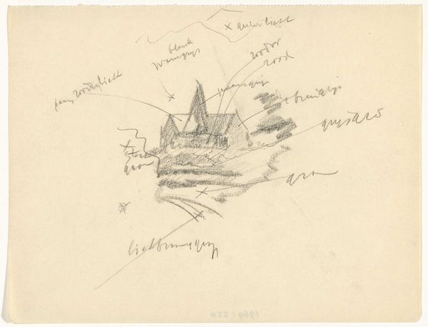 This is Gerrit Willem Dijsselhof's drawing 'Waterplant, met kleurnotities' created with graphite on paper. The drawing offers a glimpse into Dijsselhof's analytical approach to form. Notice how the radiating lines of the water plant's leaves create a sense of dynamic movement, emerging from a concentrated center, while the muted tones lend an air of quiet observation. Dijsselhof’s approach reflects an interest in the underlying structures of nature, akin to the botanical studies of the era. The annotations scattered across the composition act as a semiotic layer, revealing the artist's thought process. These notes disrupt the conventional viewing experience, inviting us to consider the relationship between observation and interpretation. They challenge the idea of a fixed representation and instead, highlight the subjective act of seeing and recording. The drawing's formal qualities and the interplay of line, form, and annotation create a dialogue between objective representation and subjective interpretation. This exemplifies how art can destabilize established modes of perception.