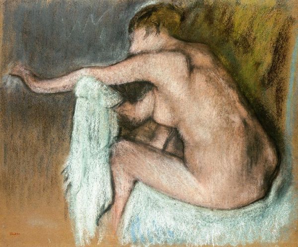 Editor: So, we have Degas' "Bather Stepping into a Tub," circa 1890, likely pastel on paper. The first thing that strikes me is how intimate it feels, like we're intruding on a private moment. What do you make of it? Curator: The intimacy you observe is precisely where its historical weight lies. Consider the changing role of women and the depiction of the female nude in the late 19th century. Degas shifts from idealized, classical forms to a focus on the everyday, even the mundane. He's showing us a modern woman in her private space, devoid of the male gaze traditionally associated with nude painting. It reflects the rising influence of Realism and Impressionism, concerned with representing modern life honestly. Do you see the way this challenges established academic painting? Editor: I think so. It's not a goddess or an allegory; she's just a woman taking a bath. Almost shockingly ordinary. Curator: Exactly! And the pastel medium itself is crucial. It allowed Degas to capture fleeting moments, impressions of light and color, which aligns with Impressionistic ideals. But beyond that, pastel offered a certain intimacy, a directness of touch, aligning with the subject matter. The quick strokes almost mimic the fleeting nature of the bathing ritual itself. But does this raise any ethical questions? Editor: It does a bit. While it departs from older objectifications, are we really free from voyeurism? Is he celebrating female experience or exploiting it? Curator: Those questions are essential, and many scholars have debated that point. The very act of representation is never neutral, and Degas’ work prompts us to consider the complex relationship between artist, subject, and viewer within its social context. What do you think of its cultural relevance today? Editor: Well, I think we need to constantly interrogate these portrayals and acknowledge both the progress and the problematic aspects. Thanks; it's much more complex than I initially perceived! Curator: Indeed. Art history isn’t just about aesthetics; it's about understanding the visual politics that shape our perceptions.