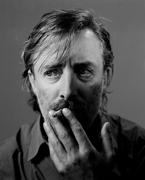 Editor: Richard Hamilton's Palindrome presents us with an intriguing self-portrait, dominated by his expressive hands manipulating what appears to be toothpaste. What symbols or cultural echoes do you perceive in this image? Curator: The toothpaste is key. It's ephemeral, reversible– a perfect "palindrome." Consider its daily ritual: squeeze out, brush, rinse, spit. A cycle of cleansing and renewal. The floating pill might suggest health or illness, perhaps a nod to fleeting moments in time. What do these gestures evoke for you, in terms of the human condition? Editor: I hadn’t considered the cycle of toothpaste. It does make you think about these daily rituals and how they reflect our lives. Curator: Exactly. It’s in these repeated gestures that we find a reflection of ourselves. Editor: I see it now. Thanks!