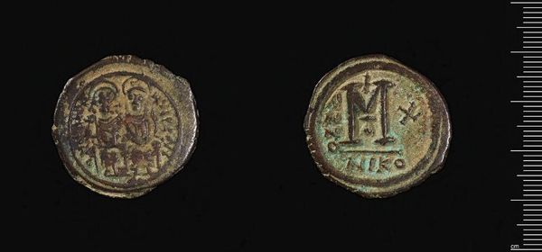 Curator: This is a Coin of Justinian I, currently residing here at the Harvard Art Museums. Editor: The way the metal has aged gives it such a weighted, somber feeling. Curator: It's a glimpse into the reign of Justinian, a period marked by legal reforms and significant building projects. These coins served not just as currency, but as propaganda. Editor: Note the details. The lines composing the face, the bold "M" on the reverse—each element carefully arranged to convey authority. Curator: Absolutely, and consider the context. This coin circulated in a society grappling with complex social hierarchies and religious divides. Editor: The formal qualities of this coin speak to the power structures of the time. Curator: I find it interesting how a coin like this connects to contemporary conversations about power and representation. Editor: I'm always struck by how simple geometric forms can become tools of expression. Curator: It is a complex relic of a complex past. Editor: Indeed, a small object carrying immense weight.