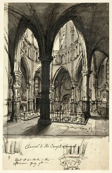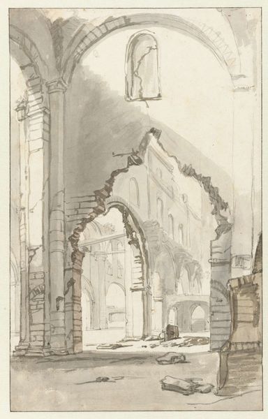 Editor: Here we have Jan Hendrik Verheyen's "A Townscape with a Churchgate," made sometime between 1793 and 1846. It’s a drawing with pen, maybe even a print. I am immediately drawn to its level of architectural detail, almost like a technical blueprint rather than a picturesque view. What stands out to you when you examine it? Curator: The method of production speaks volumes. The careful, repetitive pen strokes, almost mass-produced in their uniformity, mirror the rising industrialization of the period. The act of creating this cityscape, the labor invested in replicating architectural elements, contrasts sharply with Romanticism's supposed emphasis on individual expression. Editor: So, you see a tension between the subject and the means? The romantic subject with emerging industrial production? Curator: Precisely. Consider the workers in the foreground. Are they romanticized figures or just laborers within a rapidly changing social structure? The drawing isn't just *of* a town; it’s *about* labor, the material conditions of urban life, and the role architecture plays in defining social hierarchy. The drawing medium itself becomes a document of its time. Editor: That makes me rethink the whole piece. I was caught up in the neat lines, but the repetitive action of creating those lines, alongside the figures working in the street… Curator: Think about the materials, too. Paper, ink – commodities of an increasingly globalized economy, making artmaking and, more importantly, distribution easier, and potentially democratizing access in unprecedented ways. How might these materials and processes influence how we consume this image? Editor: It’s fascinating how looking at materials and means transforms my understanding of what I originally perceived. It shifts from a romantic architectural rendering to something more akin to a social document of labor and emerging economies. Curator: Exactly. By investigating the process and materials we unveil hidden layers and meanings!