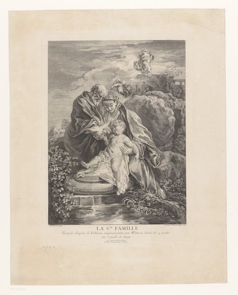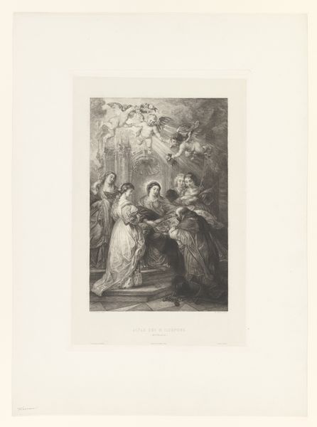 Curator: Here we have "Hemelvaart van Maria," or "The Assumption of Mary," an engraving by François Jean Villain, dating from the period of 1818 to 1852. It’s part of the Rijksmuseum’s collection. Editor: My first impression is one of ethereal ascension, a floating movement rendered in delicate lines. It’s very classical in its composition but feels surprisingly dynamic for such a traditional subject. Curator: Indeed. The upward gaze of Mary, her outstretched arms – these are traditional tropes signifying transcendence. But look at the host of faces surrounding her. They are quite uniform. They feel like visual echoes, reinforcing the collective significance of this event. How might that standardization affect our emotional connection? Editor: I think the effect is fascinating. While Mary is clearly the focal point, the uniformity of the surrounding figures suggests a broader communal ascension, perhaps mirroring a desire for social harmony during the Restoration period in France. Villain’s career developed at a time of revolutionary disruption of religious orders in the France. Religious subjects became very public as part of shaping national identity and moral standards. Curator: It raises the question: Is this personal salvation, or is it a symbolic representation of the collective aspiration of society itself? The visual emphasis is key, consider the subtle, emotive language of line in contrast to the rigid doctrines defining religion during this period. Editor: And let’s not forget the role of printmaking in democratizing these images. Unlike unique paintings commissioned by the elite, prints could circulate widely, bringing these visual symbols into everyday homes and influencing popular piety. The visual impact shaped perception in unexpected ways. Curator: Exactly. It allowed the image of Mary, a powerful maternal symbol, to permeate social consciousness, influencing concepts of faith, family, and national identity on a grand scale. I notice that faces in the multitude seem rather androgynous or homogenous which is unexpected considering this topic. Editor: This visual strategy serves to amplify the feeling of mass religious sentiment during this turbulent historical time. Curator: An interesting perspective, looking at how the artist captured the intersection of individual spirituality and public perception through powerful visuals, I'm even more aware of its complexity now. Editor: Agreed. By considering both its aesthetic choices and its historical context, we've unveiled a deeper understanding of this piece.