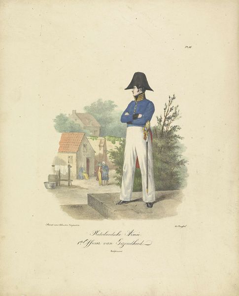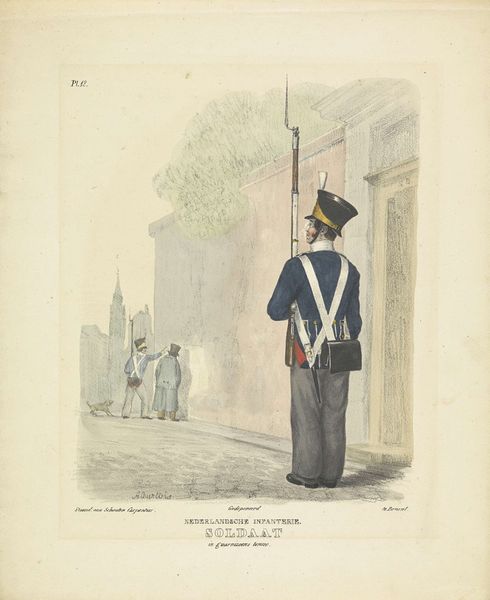 Editor: Here we have "Nederlandsche Armée/Soldaat der Nationale Infanterie" by Jean-Baptiste Madou, made sometime between 1823 and 1827. It’s a watercolor print, and what strikes me immediately is the stillness. The soldier looks so formal, yet there's a hint of weariness about him. What do you make of it? Curator: Weariness... yes, I see that too. It's more than just a portrait, isn't it? Look how Madou positions him not heroically on a battlefield, but against a crumbling wall with weeds. It suggests the less glamorous, everyday reality of being a soldier. Makes you wonder about his story, doesn’t it? Editor: Definitely! It almost feels like a history painting disguised as a genre scene. I’m curious, what's the significance of portraying him in such a state of… quiet vigilance? Curator: Well, think about the historical context. The Netherlands had just emerged from the Napoleonic Wars. This soldier represents a nation rebuilding, finding its footing. Perhaps Madou is commenting on the cost of that newfound peace, the constant watchfulness required to maintain it. Or perhaps I’m reading too much into it… What do you think? Editor: No, I think that resonates. He seems burdened by the weight of responsibility. The detailed uniform contrasted with the decaying background really emphasizes that idea. Curator: Exactly! Madou wasn't just painting a soldier; he was capturing a moment in time, a feeling of resilience mixed with fragility. Art often asks us not just to look, but to imagine ourselves *into* the picture, doesn't it? To *become* the soldier. Editor: It definitely gives you a new perspective. I had initially seen only a portrait, but now it seems far more complex, a rumination on duty and aftermath. Curator: And isn’t that the joy of art? It begins with a simple surface and takes us to unsuspected places of discovery. It shows us more about our own lives, and it has about this soldier's.
