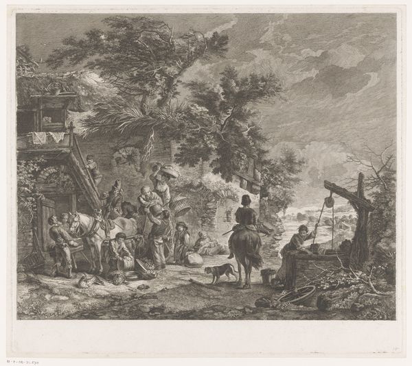Curator: Here we have an engraving from 1762, “Two Women and Two Men by the Pyramid and Ruins,” currently held at the Rijksmuseum. It’s attributed to Cathérine Elise Cousinet. Editor: My immediate sense is one of romantic melancholy. The delicate lines of the engraving capture a wistful stillness among the crumbling ruins and looming pyramid. Curator: It’s fascinating to consider how the artist positions figures within these historical ruins. They become almost props in a tableau, prompting questions about power, spectatorship, and our relationship to the past. Think of the fashion for "grand tours" among wealthy Europeans at this time; were prints such as this a form of historical tourism? Editor: Precisely! And what does the pyramid itself signify? It’s clearly crumbling, overgrown with vegetation. It becomes less about the glory of an ancient civilization and more about the inexorable march of time. Consider also the careful grouping of figures. One man actively gestures, perhaps narrating some historical moment, while others seem lost in thought. Are they contemplating their own mortality? Curator: It’s interesting to note the visual emphasis on decay. The ruined structures serve not only as picturesque backdrop but also symbolize societal and perhaps political instability. We could even draw a parallel to anxieties around the French monarchy at that time. It almost seems the figures contemplate not just history but the possible collapse of their own present. Editor: And the lush overgrowth, even as ruins surround them! There is an ever-present, persistent rebirth occurring side by side with this decline. It makes me wonder what symbols were personally evocative for Cousinet. The engraving is a stage where these characters interact, each embodying a different form of mourning or understanding loss. Curator: Indeed. Cousinet offers a nuanced commentary by contrasting these themes within what was originally a commercial enterprise meant to provide an aesthetic product for consumption. Editor: Exactly! This is what makes this engraving so interesting, beyond just its surface appeal; the dialogue between civilization, ruin, and the figures' individual responses creates layers of symbolic weight that resonate even now.