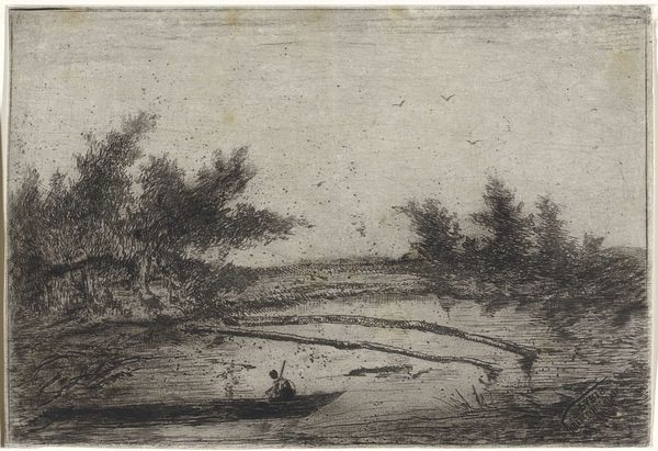 Arnoud Schaepkens created this small etching of a lake with a boat sometime during the 19th century. Schaepkens lived through a time of immense social and political change in Europe, including rising industrialization and urbanization. The image depicts a solitary figure in a boat on a tranquil lake, surrounded by natural barriers. It evokes a sense of quiet contemplation, perhaps reflecting a longing for simpler, more pastoral times amidst rapid societal shifts. Consider how this image speaks to the human desire for peace and solitude. The lone figure in the boat could represent the individual navigating the complexities of life, seeking refuge in nature. It suggests that even in the face of overwhelming change, there remains a deep connection to the natural world and a need for personal reflection.