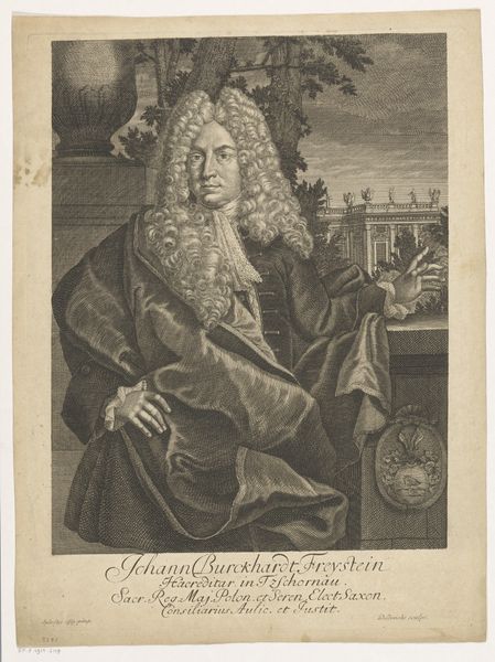 Martin Bernigeroth's portrait of Hieronymus Jacob von Ryssel, now at the Rijksmuseum, presents a study in structured contrasts and symbolic space. The sitter is staged amidst architectural elements with rigid lines that frame a distant, softer landscape. Consider the duality here: the man's imposing wig and draped fabric juxtapose against the stone's angularity, creating a dialogue between natural form and constructed environment. Hieronymus's pointed finger leads the eye, creating a compositional line that suggests direction and purpose. The inclusion of the coat of arms grounds the image in a system of signs and identity. The print, through its formal arrangement, does more than depict a person; it presents a statement about social position and the individual's place within a structured world. How do these elements combine to reflect both the man and the times?