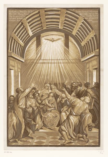 Curator: So much light! It’s as if the whole painting is radiating. Editor: And that’s precisely what Titian, the master of Venetian painting, intended with "Pentecost." Painted in 1545, it captures the biblical scene of the Holy Spirit descending upon the apostles. Look at how the composition directs your gaze upwards, towards that intense divine light embodied by the dove. Curator: You know, sometimes these old biblical scenes can feel...stiff. But here, there’s a raw energy. People are reacting, truly experiencing something. It's not just a staged tableau. Editor: Absolutely. Titian was deeply involved in the political climate of the era and this informed his artistic interpretation of scripture. His use of color and dynamic poses injects a sense of drama. You can almost feel the heat, the astonishment of the moment. Curator: I see what you mean about the heat. I can feel the colors working almost as waves, coming at me. I am drawn to Mary in this picture. Surrounded by that electric-shock white, she's serene, right in the eye of this storm. Editor: I'd add, while her central location aligns with religious art conventions, placing her at the focal point, Titian’s work still challenged tradition by presenting her, and the apostles, as dynamic individuals caught in a moment of intense spiritual change, reflecting Renaissance humanism. It wasn’t merely about dogma; it was about human experience. Curator: Looking at the scale, one must consider the position the people are posed. Titian's painting captures a moment of human vulnerability; it reveals faith in action through figures. A grand declaration, this! I do have to appreciate that. Editor: It's interesting how a painting from so long ago can still spark these conversations. Art has the power to bridge centuries, inviting us to reconsider narratives and question norms. Curator: You’re right. And, as we’ve seen today, an artist isn’t just painting an image, he's documenting experience. It all lives on in these colors.