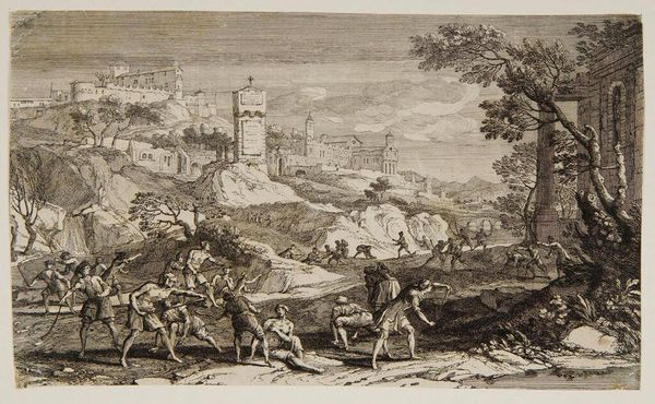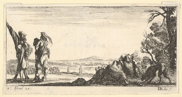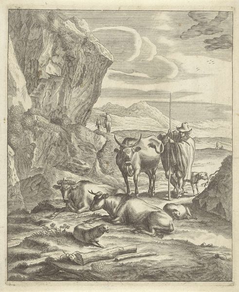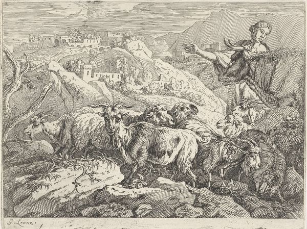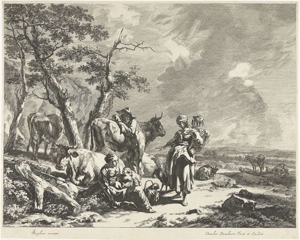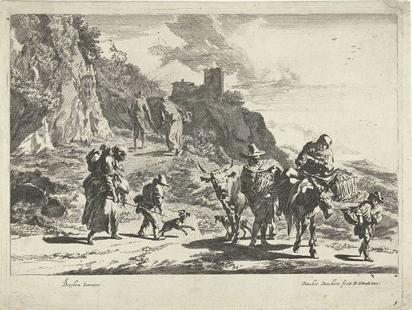 Curator: Look at how the artist uses line! This piece, an etching by Cornelis Visscher, is called "Staande Spinster", made sometime between 1638 and 1658. I’m immediately struck by its pastoral calm. What do you think? Editor: It has a strange tension. There’s this immediate feeling of rustic charm, but also an unsettling emptiness to the landscape, almost like a stage set. Curator: I see what you mean. Visscher was working at a time when the Dutch Republic was consolidating its wealth and power. Genre scenes like this, depicting everyday life, became popular, not just for their aesthetic value, but also for what they revealed about the values of Dutch society at the time. The artist clearly captures an everyday life, though, no? Editor: He does, but look closer. Notice the dramatic shadows, the way the lines create a sense of depth and volume in the figures? And that crumbling tower in the background - the sharp, directional lines against the cloudy skies! These elements seem like typical landscape conventions but seem forced, don’t you think? The foreground pulls my eye in with those lines, but then my focus falters. Curator: True. But think of the function of genre-paintings at the time. By showing scenes of humble labor, there was a clear projection of ideals of simple, honest living to emulate. Visscher uses conventions—both the landscape and the figures—to represent something very intentional. It’s no accident these country scenes gained popularity during times of political change in the Netherlands. It certainly does represent that political background! Editor: It might. However, I cannot help to focus my eyes on its overall visual dynamic, regardless of its purpose. Even though the line work is controlled, Visscher isn’t afraid to let certain areas fall into shadow, creating drama out of the commonplace, just as he’s contrasting architectural remains to represent a particular place or space in mind. Curator: You know, it’s easy to get lost in the beauty and overlook the social context that shapes it. Seeing them side-by-side helps give such richness! Editor: Precisely! Paying attention to both context and visual dynamic transforms an aesthetic study into one full of historical purpose.