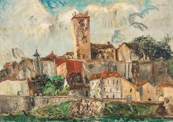 Editor: This is "View from the Bridge in Espaly" by Tadeusz Makowski, painted in 1920 using oil paints. The composition feels dense, almost like a tapestry woven with houses and figures. What symbolic meaning do you see in such a crowded landscape? Curator: The tightly packed composition, reminiscent of medieval cityscapes, speaks to the collective identity of this village. Notice how the houses, all crowned with terracotta roofs, huddle together as if seeking mutual support. Doesn't this arrangement reflect a deep-seated need for community, a sense of belonging rooted in shared history and hardship? Editor: Absolutely! And the people in the foreground, working the land... it’s as if they’re inextricably linked to the place. Is Makowski saying something about the human connection to the land? Curator: Precisely. Observe the figures carrying scythes, or the oxen pulling heavy carts. These are age-old symbols of labor, connecting the inhabitants to generations past. Their repetitive actions evoke a cyclical view of time, reinforcing the idea that life is interwoven with the rhythms of the earth. Consider, too, the warm palette – those earthy ochres and siennas suggest a profound sense of grounding, don’t they? Editor: Yes, I see it. There’s a timeless quality to the scene, as though it exists outside the modern world. Curator: Indeed. While painted in 1920, the painting shies away from the mechanical aesthetics of the industrial era, embracing instead enduring symbols of communal life and human dependence on nature. We see memory preserved. Editor: I hadn’t thought about the painting as a preservation of cultural memory. Curator: Consider how the artist distorts perspective, favoring emotional resonance over strict realism. The artist seems determined to weave us into the symbolism itself. How can we forget this artwork? Editor: It certainly gives you a lot to think about, connecting the past and present.