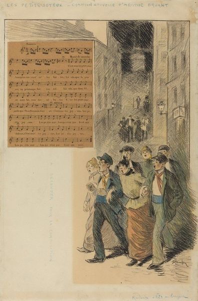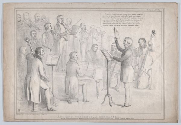 Editor: This is "The Orchestra During the Performance of a Tragedy" by Honoré Daumier. The lithographic texture feels so dynamic, almost chaotic. What strikes you about the composition? Curator: Note how Daumier employs strong contrasts in light and shadow to emphasize the emotional intensity. The sharp, angular lines contribute to a sense of unease. Do you observe any repeating shapes or patterns? Editor: I see that the music stands create a visual rhythm, but the figures seem disjointed. Is that intentional? Curator: Precisely. The fractured forms suggest a deeper psychological reading, a commentary on the disconnect between performance and genuine emotion. The figures express a raw, visceral response. Editor: That’s fascinating! I hadn't considered the emotional impact of the lines themselves. Curator: Indeed. It is in this convergence of form and emotion that Daumier's artistic genius truly shines.