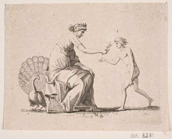Curator: I must admit, there’s an immediate tension to the stark contrast here. The dynamic struggle really leaps off the page, don’t you think? Editor: Indeed. We're looking at an engraving titled "From an Original Sketch of William Hogarth's in the Collection of Mr. Morrison," executed by Richard Livesay in 1782. It resides here at the Met. And I would add that the linework gives it an immediate rawness, an immediacy… appropriate considering its allegorical subject matter. Curator: Quite right. Observe how Livesay employs a fairly minimal number of lines to delineate the human form versus the skeletal figure. The textures of the bone, suggested through a delicate scrim of closely-knit hatching and cross-hatching. It achieves a remarkably palpable quality through suggestion, rather than explicit detailing. Editor: I'm immediately drawn to Livesay's source material. We're told it's "From an Original Sketch of William Hogarth's". Who was Mr. Morrison? And more to the point, how does this print operate as a medium for disseminating and cementing Hogarth's reputation decades after his death? The layering of hands is intriguing. Curator: Interesting point! To pivot back to composition, notice how the intertwined figures occupy almost all the available space within the frame, amplifying the sense of conflict. This evokes that raw Hogarthian social critique with Academic elegance. Editor: I would argue it elevates printmaking. To circulate art and to challenge notions of artistic authorship by allowing artists such as Livesay, who often worked on commission and from others' designs, to leave their mark, but in service of Hogarth. The work feels very connected to the burgeoning printmaking economy of the time. Curator: Certainly, you offer a potent understanding of the work's environment. Personally, the expressive simplicity captures my gaze. The work remains relevant as a comment on mortality versus artistic practice. Editor: Ultimately, the convergence of craft, labor, and legacy speaks to the piece’s complex story. Thank you for discussing.