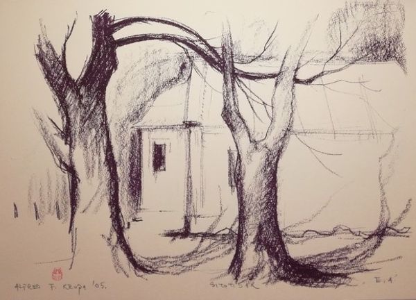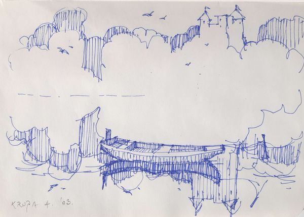 Editor: This is "The sketchbook page," a pen and ink drawing from 2002 by Alfred Freddy Krupa. It’s a fantasy landscape... really a rather striking image. What catches my eye is the contrast between the dragon looming over the castle and the knight below. What do you see in this piece? Curator: I'm immediately drawn to the visual language Krupa employs here. The sketchy, almost frenetic lines evoke a sense of urgency and imagination, connecting us to centuries of mythical imagery and knightly quests. Consider how dragons historically function as guardians of sacred spaces. The composition seems to be referencing that familiar trope of protection...or perhaps a looming threat? What emotional quality is the artist assigning to the dragon and the knight? Editor: It's almost dreamlike, this battle. Is the placement significant, with the dragon above and the knight below? Curator: Absolutely. Think about the symbolic weight of "above" and "below." Dragons, often associated with chaos or the untamed natural world, positioned atop a castle... a symbol of order and human aspiration. Yet a lone knight approaches; that is intriguing. There is no indication in the art that anyone within the castle acknowledges the drama happening right outside of their walls! What narratives about protection, authority, and perhaps a bit of hubris do these symbols convey? It becomes a tableau for examining cultural values regarding bravery and the unknown. Editor: I hadn’t considered that level of symbolism. It’s fascinating how much is packed into such a simple sketch! Curator: Indeed. This seemingly simple sketchbook page becomes a lens through which we can examine cultural narratives of power, protection, and the eternal conflict between order and chaos. The raw sketch aesthetic only makes these messages that much more forceful.