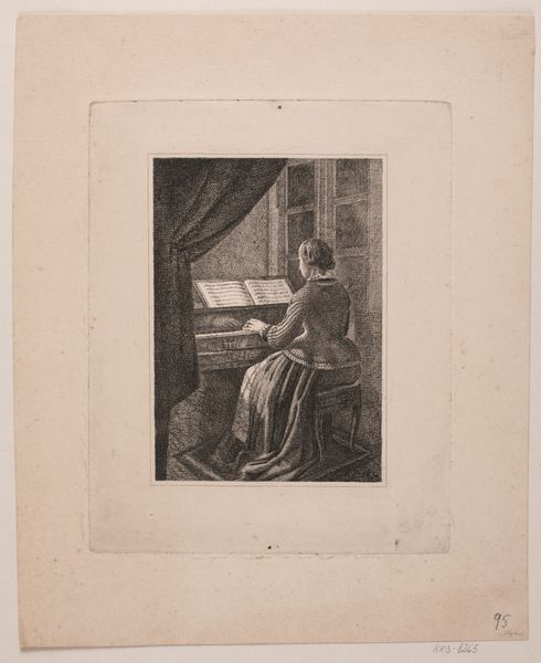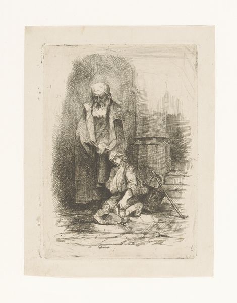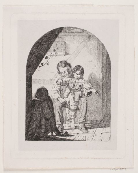 Curator: Here we have Waldemar Bøhme's etching, "Den hellige biskop Jon og Sæmund Frode," created in 1878, a rather intriguing example of 19th-century Danish art housed at the Statens Museum for Kunst. Editor: It's immediately striking, this sense of hushed scholarly activity, a quiet tableau framed by what looks almost like a fairytale archway. There’s a weary kind of solitude that permeates it. Curator: Precisely! It encapsulates a very specific historical narrative, placing Bishop Jon and Sæmund Frode, important figures of Icelandic history, in a moment of… scholarly engagement, shall we say. Consider the symbols embedded in the archway above them: images of mythical characters enacting various exploits. It speaks volumes about how the past was not simply history but also a realm of archetypes. Editor: Right, these aren't just portraits, but representations wrestling with Iceland's evolving identity! And the sleeping dog in the foreground, oblivious to their intellectual efforts, such a perfect touch! But there's something deeply intimate about the way Bøhme renders the light; it focuses our attention on their interaction. The composition invites contemplation. Curator: It's an interior space where history, mythology, and personal narratives intersect. The heavy shadows add to that air of contemplative isolation. Etchings of this kind served a vital function; making historical narratives and artistic expression accessible to a broader audience. It reminds us that access to knowledge and the shaping of identity were not always so democratized. Editor: You’re so right, in its quiet way, it asks, "Who gets to tell our stories?" This etching acts like a gentle reminder that echoes through the centuries, as if whispering forgotten lore, one laden with ink and dreams. Curator: Indeed. The visual encoding of these figures and stories provided a way of remembering. These artworks created enduring cultural resonance. Editor: Well said.
