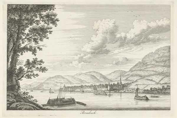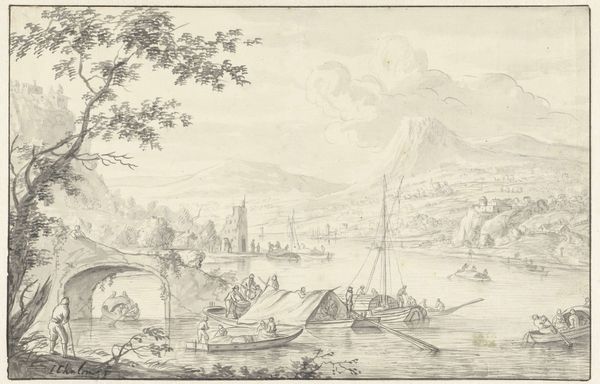 Curator: Welcome. Here we have Hendrik de Leth's "Drachenfels, gezien vanaf de Rijn", created around 1767. It’s a wonderfully detailed pen drawing depicting a scene along the Rhine. Editor: It’s really captivating! The delicacy of the lines, the almost monochrome palette... it has this strange feeling of both grandeur and melancholy. There's a real sense of scale, emphasized by the tiny figures along the shore, which really heightens the impact of the landscape. Curator: Yes, the use of line work is quite remarkable. De Leth expertly uses varied densities and thicknesses to define forms and create a sense of depth. You can also see, culturally, how landscape was taking hold as a prominent subject in art, mirroring a growing appreciation for nature within Dutch society. Editor: I'm curious about the viewpoint. It almost feels romanticized, framing the scene as if we are privileged observers. There’s an interplay here, a certain tension between nature's sublimity and humankind's efforts to navigate and perhaps even control it via transportation on the river. And are those castle ruins at the top? A clear nod to the past and power. Curator: Indeed. The ruined castle on Drachenfels holds a particular symbolic weight; you find these structures appear over and over, visual reminders of histories and narratives interwoven into the landscape itself. De Leth's artistry helps transmit collective ideas about the sublime but also reflects social conditions surrounding how landscape becomes understood. Editor: Thinking about the boats and the figures populating the riverside, this vista, even with the dramatic mountain, becomes infused with a certain socioeconomic presence, doesn’t it? Transportation of goods, exchange, movement... a vibrant ecosystem existing below the looming castle ruins. Who did he produce work for, do we know? What statements was he hoping to produce about the area? Curator: De Leth’s background in cartography suggests he likely made art available for those involved in travel and trade—consumers deeply implicated within imperialist projects. His imagery undoubtedly helped shape views about nature's availability, but also the value of historic sites at this stage. His illustrations, in effect, helped manufacture social meanings through commercial images. Editor: Absolutely, images circulating through growing commercial channels become the grounds upon which both experiences and knowledge become exchanged. Well, it's certainly provided me a good bit to contemplate. I'll be pondering those tiny figures on the shoreline for some time. Curator: A fantastic set of reflections indeed!