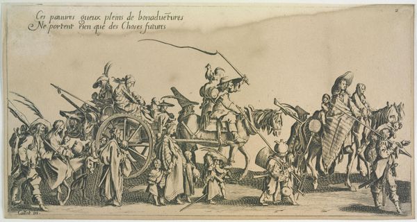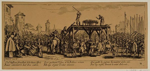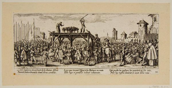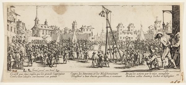 Editor: This is Jacques Callot’s engraving, "Afstraffelse ved radbrækning," or "Punishment by breaking on the wheel," from 1633. It's…intense. There’s a huge crowd scene, a city in the background, and then this raised platform where some terrible act is about to occur. What can you tell me about this print? Curator: Well, immediately, I’m drawn to consider the means of its production. Callot, a master engraver, is using a *burin* to incise lines into a copper plate. Think about the labor involved, the precision required. This isn’t some spontaneous gesture; it’s a carefully constructed object intended for mass dissemination. Consider that: witnessing and participating from a distance. Editor: Mass dissemination of, essentially, a public execution? Curator: Exactly! The engraving becomes a commodity, consumed by an audience eager for these dramatic depictions of justice, or, depending on their perspective, a condemnation of unjust power. What materials would the crowd participating need for the even: food, beverage, clothing? How are those made, by who, what do those making those items think about what the buyers intend? Editor: So, the print is both a work of art and a form of propaganda? Curator: It’s both, and neither. Callot’s craftsmanship elevates it beyond simple propaganda, but the subject matter forces us to confront the social and political realities of 17th-century justice, particularly the production of justice. Does the starkness of the medium enhance the sense of brutality, or does it create a necessary distance for reflection? Editor: I never considered the connection between the engraving process itself and the subject being portrayed. I suppose art is not divorced from labor after all! Curator: Precisely! The materials and means of production are inextricably linked to the artwork’s meaning and its role within society. Editor: Thanks, that's given me a whole new perspective on how to view the piece. I think understanding the material process really makes a big difference.