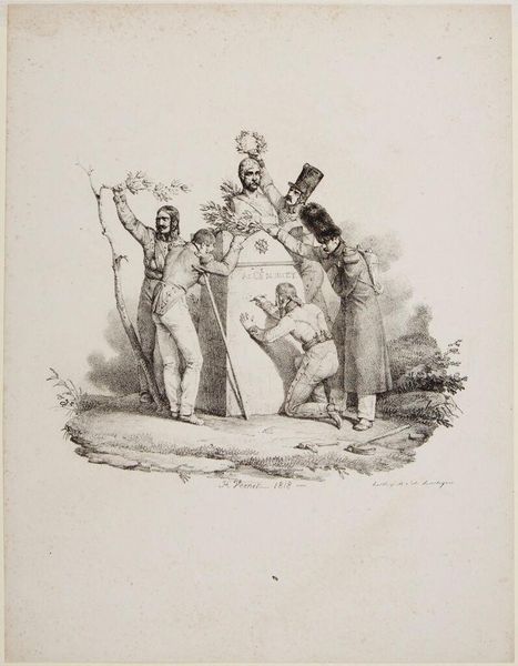 Editor: This is Nicolas Toussaint Charlet's "Poster Bearer." I’m struck by the composition: the figure receding into the distance, the poster dominating the view. What do you see in the formal elements of this piece? Curator: Observe how the artist utilizes line to delineate form, creating a dynamic interplay between light and shadow. The texture of the paper itself contributes to the overall aesthetic, adding depth. Editor: So, it's less about the 'what' and more about the 'how' in this case? Curator: Precisely. The essence lies in the application of artistic techniques and the interplay of visual components, independent of overt narrative content. Editor: That's a fascinating perspective. I'll definitely look at art differently now. Curator: Indeed. Focusing on these elements allows for a richer appreciation of the artist's choices and the work's inherent qualities.
