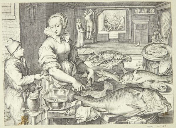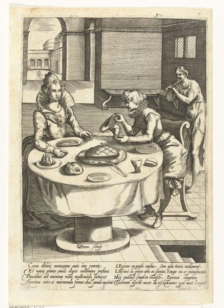 Editor: So, here we have a 17th-century engraving by Philips Galle, titled "Voeding van het lichaam wordt belangrijker geacht dan voeding voor de ziel"—that is, "Nourishment of the body is considered more important than nourishment for the soul." The detail is incredible. There's a bizarre, almost unsettling mood about it...an ass in a fancy feathered headpiece, seated at a table laden with food. What do you see in this piece? Curator: I see a powerful indictment of earthly priorities rendered through potent symbolism. The ass, adorned in finery, instantly registers as folly and misplaced value. Notice how he's presented equal to, perhaps even favored over, the human figure who feeds him. It evokes a world where superficial pleasure eclipses deeper intellectual and spiritual pursuits. The piper represents a distraction, further diminishing awareness of a higher purpose. Don't you find the architectural setting both grounding and claustrophobic? Editor: Definitely. The archway in the background gives a sense of space but it is almost entirely blocked, drawing attention to the interior. Is the table with food and drink an allusion to "the last supper?" Curator: The Last Supper provides interesting contrast, it's definitely more a commentary on the decadence of the era. Consider that the objects themselves carry meaning. The abundance of food signals indulgence, and the placement of a grotesque donkey suggests the bestial or uncivilized overtaking humankind, losing oneself in pure gratification. The engraving employs visual symbols, referencing the continuous struggle between reason and desire. Editor: So, Galle is making a broader point, beyond just critiquing eating habits. Curator: Exactly. It reflects on how we choose to feed ourselves, materially versus spiritually. He seems to be saying that neglecting inner enrichment leads to absurdity, symbolized by the feathered ass at a feast. The inscription makes that very clear, also. Editor: I never would have picked up on so much. Seeing how the artist used symbols makes me view it as a wake-up call. Curator: Indeed, and an eternal reminder that transcends the Baroque period.