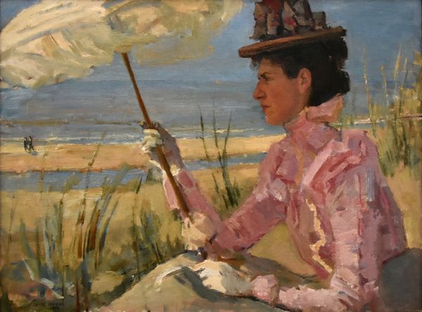 Curator: "Young Woman Looking Out to Sea" was painted by Isaac Israels around 1900. The Rijksmuseum in Amsterdam holds this pensive oil-on-canvas piece. Editor: The instant impression is melancholy. The cool hues, the solitary figure… She’s absorbed, almost disappearing into that vast sea. It's beautifully isolating. Curator: It's evocative, definitely. Seascapes in art are commonly laden with symbolic weight, mirroring our internal emotional states, often isolation as you say. Note how her hat is contrasting both with her face and her dress, setting her apart, almost. Editor: Her attire gives her away! Very end-of-the-century finery. Her elaborate hat hints at both status and confinement, doesn't it? Like the trappings of womanhood in that era, beautiful but also a cage. What kind of visual references do you think Israels was engaging with, if any? Curator: Well, we can place him firmly within the tradition of Impressionism, obviously. But look beyond that to the echoes of earlier Romanticism. Think of Caspar David Friedrich's solitary figures dwarfed by nature. This is, visually and emotionally, very much in that lineage. The sea almost has the role of the sublime, threatening force in her story. Editor: Hmm, I love that. But it could also just be a lazy beach day for a society woman... The haziness kind of implies leisure to me. But you know, the way the light catches the fabric of her dress, how fleeting those brushstrokes are... he certainly evokes a specific mood with seemingly simple tools. It makes you think, what is *she* thinking? Curator: Perhaps she represents a turning point. A moment of looking out, looking forward to what's next. I see some ambiguity in the portrait between leisure and yearning. Editor: Ultimately, I like how Israels lets that moment stay undefined, allowing for the viewer to decide. She stays with us. Curator: Agreed, and what appears effortless certainly hides much complexity. It is interesting to see those complexities represented here in the way that the artist seems to let a potential viewer imagine what they want to be here in that moment.