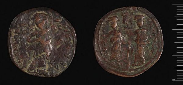 Curator: This artwork, residing here at the Harvard Art Museums, is entitled "Faith," and belongs to "The Seven Virtues" series. What strikes you about this little disc? Editor: Its earthiness, the way the bronze seems almost molded by hand. It feels so intimate, almost like a lucky charm. Is it small? Curator: Yes, it's quite petite, a mere 4.2 cm in diameter. The anonymous artist captured Faith seated, holding a chalice and a host—symbols of the Eucharist. Editor: There's a certain weight to it, though, a seriousness. The cross in the background, the heavy robes... it speaks of devotion, but also duty. Curator: Absolutely. These virtues were often commissioned by religious orders or wealthy patrons as reminders of moral conduct, a visual catechism. Editor: Knowing that, I see the 'roundness' of this series in a different light. It’s not just an aesthetic choice, but about the all-encompassing nature of virtue in everyday life. Curator: Precisely. It transforms the divine into the domestic, the monumental into the miniature. Editor: It gives me pause. It's easy to forget that things we now consider decorative items were meant to carry so much meaning. Curator: Indeed, objects like this open a window into the spiritual landscape of another era. Editor: Yes, I feel quite differently about this object now.
