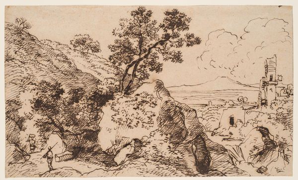 Editor: Here we have Govert van der Leeuw's "Mountain Landscape with Fortress Ruins," an etching created sometime between 1655 and 1688. It has an undeniably somber, even melancholic quality, and it makes me wonder: what narratives do you think the artist is trying to convey with these ruins? Curator: That's a very astute observation. Beyond the immediate visual of crumbling stone, this landscape engages with complex themes of power, decay, and historical memory. Ask yourself, whose stories are embedded in those ruins? Were these structures once symbols of authority and control, and what does their degradation tell us about the impermanence of power structures? Editor: It's interesting to consider power, because initially the piece felt quite passive to me. Was van der Leeuw engaging with contemporary social issues by depicting a crumbling fortress? Curator: Absolutely. In the context of the 17th century, marked by shifting political landscapes and the rise and fall of empires, depicting ruins wasn’t just aesthetic; it was a commentary. The ruins might evoke feelings about specific conflicts or the transience of earthly power. What assumptions do we bring when we view a militaristic site falling apart? It might be a triumphant feeling of liberation from oppression for some and for others it could spark fear from instability. Editor: So the act of observing, then and now, changes the context. The etching, at once aesthetically pleasing and politically charged, opens up dialogue about societal evolution. Curator: Precisely! Art like this invites us to critically examine our relationship with the past, prompting us to consider whose histories are remembered and whose are forgotten. It makes us question the narratives we inherit and the ideologies they perpetuate. Editor: I never considered the loaded politics in an image that appeared, on its surface, to be only landscape. Curator: The Dutch Golden Age saw great shifts in politics so art becomes a vehicle for subtle but poignant dialogues concerning societal values and evolving world views. It underscores the vital role art plays in mirroring and shaping the society.