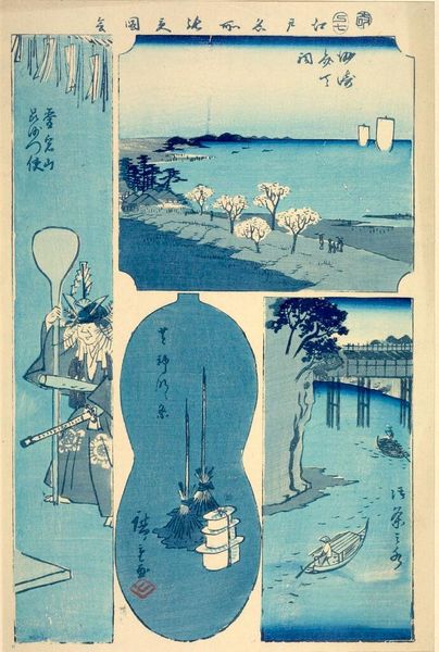 Editor: This is a print by Utagawa Hiroshige, titled "Clamdigging at Shinagawa, Waterfall River at Ōji, and Suijin Wood and the Shrine at Massaki, from the series Cutout Pictures of Famous Places in Edo." It's striking how the artist uses these distinct frames within the composition. What do you see in this piece? Curator: The interplay of shapes is critical here. Note how Hiroshige contrasts the rounded forms of the clamdigging scene with the vertical thrust of the waterfall. This contrast creates a dynamic visual rhythm. Editor: I hadn't thought about it that way. It seems like the composition is almost a study in geometric relationships. Curator: Precisely. The artist manipulates form to guide the viewer’s eye and establish a harmonious balance across these three disparate scenes. Consider also the limited palette; the varying shades of blue unify the composition. How does that strike you? Editor: That makes sense. Thank you for your insights!
