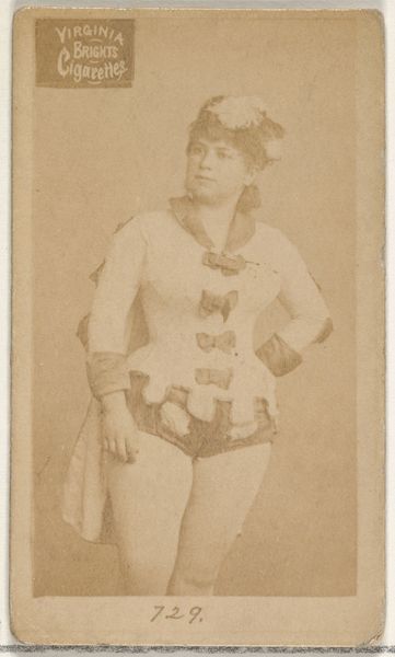 Editor: Here we have "Card 448, Gracie Wilson, from the Actors and Actresses series (N45, Type 1) for Virginia Brights Cigarettes," a photographic print dating between 1885 and 1891. It reminds me of a theatre promotional card, given its sepia tone and the subject's rather dramatic pose. How do we understand the social impact of images like these? Curator: Well, these cards were inserts in cigarette packs, part of a deliberate strategy by companies like Allen & Ginter to broaden their appeal. Gracie Wilson here, probably a popular actress, became a collectible, almost a proto-Instagram influencer. Editor: So it's less about high art, and more about popular culture? How were women viewed in these advertising campaigns? Curator: Exactly. While on one hand, it acknowledged the emerging visibility and importance of women in entertainment and as consumers, on the other, it framed them as objects of desire and admiration, contributing to the construction of idealized femininity and promoting the cigarette brand through association with beauty and success. Editor: It's interesting how something so small and seemingly insignificant as a cigarette card can tell us so much about the cultural values of the time. So, in some ways these trading cards democratized art and celebrity culture but for capitalistic incentives? Curator: Precisely. They prefigured our modern celebrity culture, but as part of the commercial project of selling tobacco. A potent example of the public role of art in shaping societal norms and expectations. I think it really gets at the power of advertisement! Editor: This puts so much into perspective. Thanks! Curator: Indeed. Looking at these ephemera helps to deconstruct seemingly innocent images.
