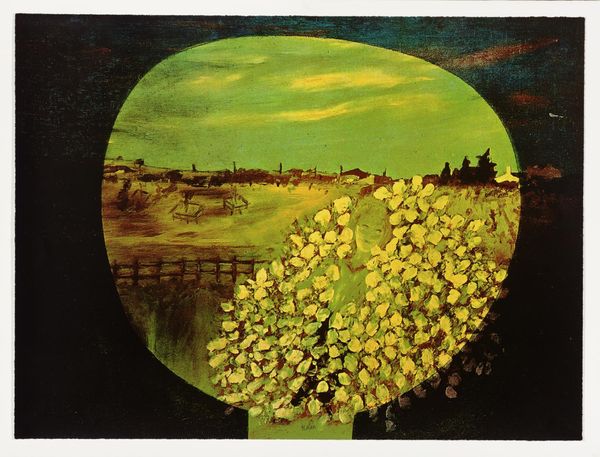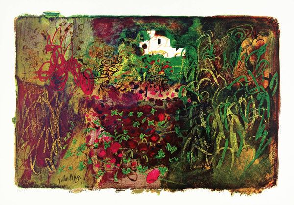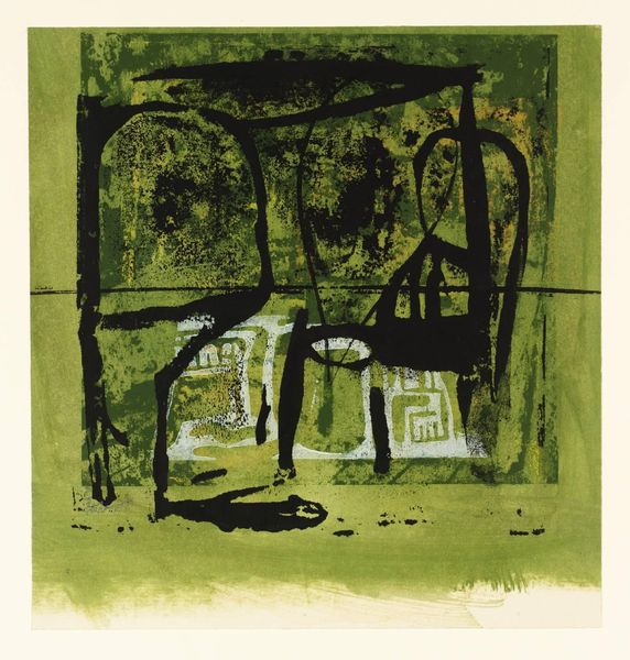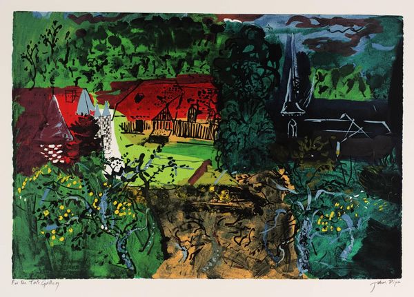 Editor: This is John Piper's "Welsh Landscape, Tretio." It's held at the Tate, and what strikes me is the layering of textures, like a collage but all painted. What can you tell me about it? Curator: Notice how Piper uses various printing techniques to achieve this layering. The materiality speaks to mass production, yet the artist's hand remains evident. How do you think this tension plays into the broader context of art and industry in post-war Britain? Editor: That's interesting. It makes me think about how he's both embracing and questioning industrial processes, through his materials. Curator: Precisely. By examining the means of production, we can understand how Piper challenges conventional notions of artistic creation and labor. I've learned something too.