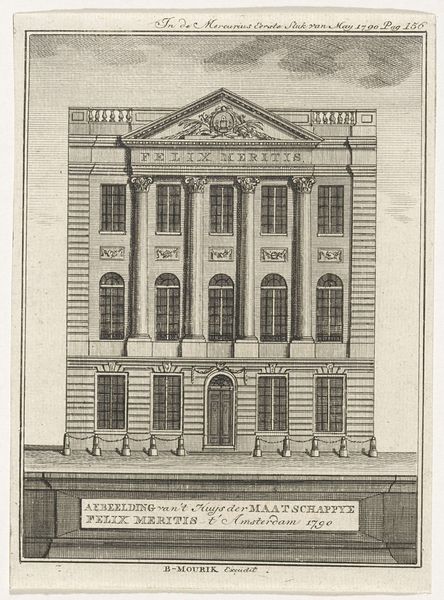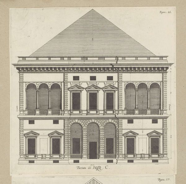 Curator: Let’s consider this engraving by Nicolaes Ryckmans, titled "Opstand van de façade van de Villa Grimaldi te Genua," created in 1622. It's currently held in the collection of the Rijksmuseum. What strikes you first about this image, as an artist? Editor: Oh, it’s this incredibly stern façade! The colossal symmetry, topped by what appears to be a looming pyramid. It's all lines and angles and gives the feeling of imposing order. Is it meant to intimidate, or inspire awe, or both? Curator: That's an insightful question. It really brings into focus the tension that Baroque architecture often grapples with—between grandeur and accessibility. Architectural prints like this served as crucial tools for disseminating designs, particularly influential during the period. Ryckmans aimed to communicate specific architectural principles from Genoa throughout Europe. Editor: So this print wasn’t necessarily about replicating the building but rather showcasing an idea, a particular approach to design? Because let's be honest, that triangular roof feels so… out of sync. Almost playful, if it weren’t rendered with such severe precision. Curator: Precisely! The facade becomes a canvas for exploring ideals of the era—the harmony of proportion, the careful articulation of architectural orders, and the display of power. Think about how printmaking facilitated the spread of the Baroque style across geographical and social boundaries. It helped to establish design standards. Editor: Hmm, that does make it slightly less severe to know that this print has a role to play! It’s like looking at the DNA of monumental architecture. And, admittedly, the sheer meticulousness in the lines is rather beautiful. Gives me the shivers just imagining the craftsman working on such a detailed depiction of this Genovese facade. A rebellion against the traditional lines and shapes of buildings back then! Curator: It truly marks a shift in the architectural conversation. Seeing this building's layout recorded is fascinating, in and of itself. Now if you look closely you might recognize what sets this apart from contemporary styles. Editor: Well, I am seeing it, that pyramid roof is unlike anything I've ever laid eyes upon. Overall, it makes for a very, how should I put it...striking building that this façade is modeled after. It truly commands you to look up in awe of its presence. Curator: Exactly! Architectural blueprints had a major impact, because they changed styles by showcasing novel designs. Editor: Fascinating to see this "rebellion" as a dialogue—an assertion of artistic principles during an evolving society! Thanks for setting the scene! Curator: My pleasure, and thank you for offering that refreshing and playful take! This allows us to contextualize what we're seeing a bit better.