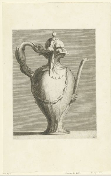 This print shows a 'Schenkkan met deksel' (pitcher with lid), and was made by Françoise Bouzonnet sometime in the 17th century. Bouzonnet was a French printmaker working at a time when women artists had to navigate considerable social constraints. During this era, artists often came from artistic families. It afforded them opportunities to learn and practice their craft within a supportive environment, and we see this with Bouzonnet, whose father was the engraver François de Poilly. Bouzonnet’s choice of subject matter, a decorative pitcher, reflects the artistic conventions of the time, where women were often directed towards still life or portraiture, fitting within the domestic sphere. Nevertheless, there is an emotional quality evoked by the careful detail given to the pitcher's form. The inclusion of a dragon as a handle might represent a subtle rebellion against the expected norms of female artistry, and a longing to break free from expectations. The image could be seen as a vessel containing both the constraints and dreams of women artists of her time.
