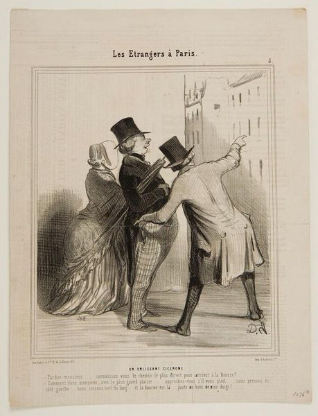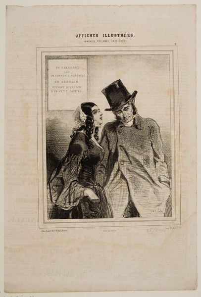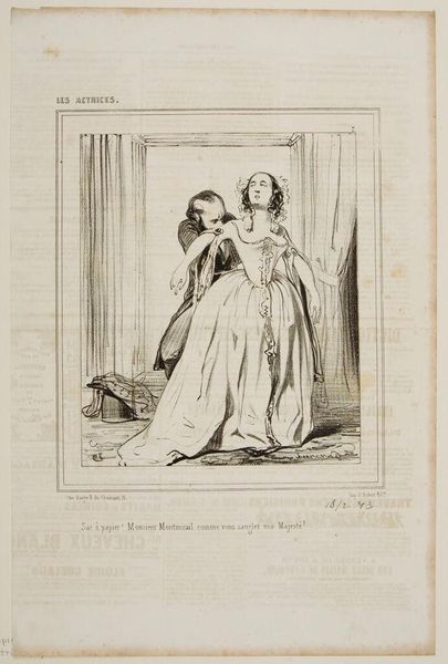 Editor: This is a print by Paul Gavarni called "How did you know, papa, that I loved Mr. Léon?" It depicts a father and daughter. I find the scene somewhat oppressive; his arm around her seems controlling. What do you see in this piece? Curator: I see a commentary on the restricted agency of women during Gavarni's time. The father's possessive gesture, coupled with the daughter's question, highlights societal constraints placed upon women’s romantic choices and voices. Editor: So, it's a critique of patriarchal power? Curator: Precisely. Consider how the print medium itself made such critiques accessible to a wider audience, fostering early dialogues around gender roles and female autonomy. Editor: That's a powerful way to look at it; I had focused only on the immediate interaction. Curator: Art often speaks to the unspoken power dynamics of its era.