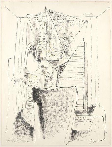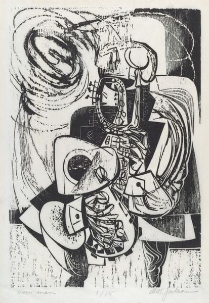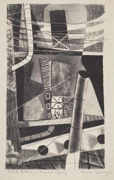 Herbert K. Kane made "Communications Outpost" using printmaking techniques. There's a real sense of process here, you know? The way the ink sits on the page, almost gritty, it feels like you can trace the artist’s hand. Look at how the texture of the paper interacts with the image. There are all these tiny specks that create a kind of visual noise, and it gives the whole thing a slightly rough, almost industrial feel. The shapes are angular and broken, like pieces of a puzzle that don't quite fit together. Then there’s that little eye, peeking out. It disrupts everything, doesn’t it? That single mark changes the whole conversation. Kane’s got this way of making the familiar seem strange, kinda like Guston. I think that's what makes art so cool: it’s not about giving answers, but about opening up possibilities.