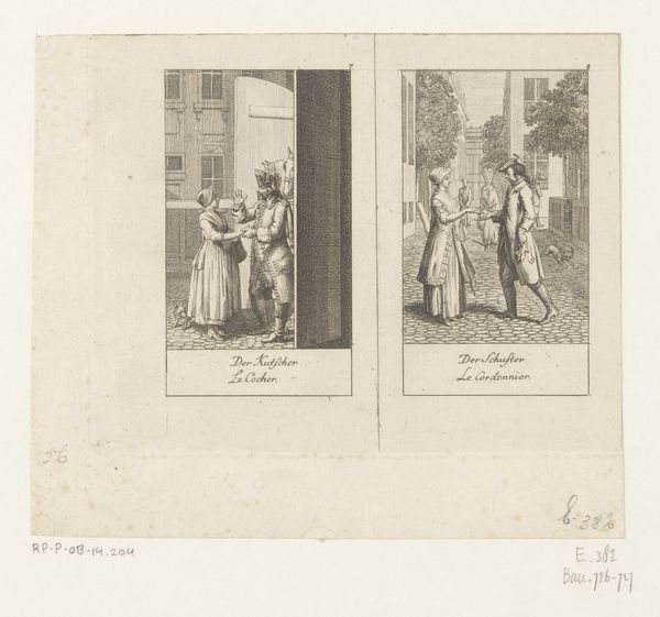 This is an engraving titled "Two Wedding Proposals" made by Daniel Nikolaus Chodowiecki in the late 18th century. The process of engraving involves meticulously incising an image onto a metal plate, which is then inked and pressed onto paper to create a print. The stark contrast between the black lines and the white paper is a direct result of this method. Chodowiecki's lines are economic, but they delineate social class. Look at the details in each panel, and think about the labor involved in producing food versus enforcing the law. On the left, we see a butcher with his wife, a side of beef hanging to the left, while on the right, a bailiff clasps hands with a formally dressed couple. The act of engraving itself carries social meaning; it allowed for the mass production and dissemination of images, making art more accessible to a wider audience. By focusing on the methods and materials of production, we can see how this print participates in broader social and economic systems, challenging our traditional notions of art and its value.
