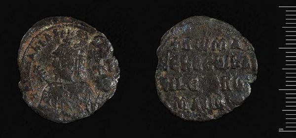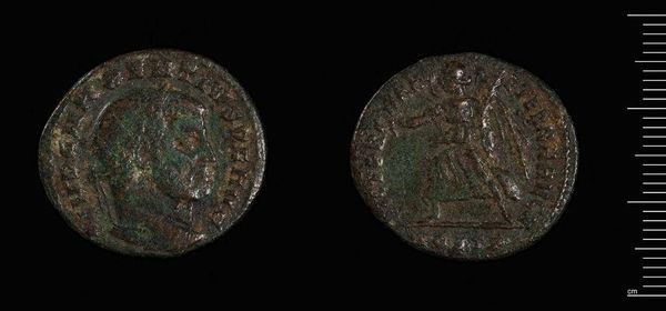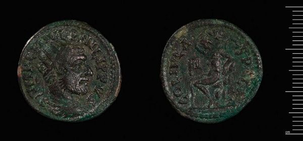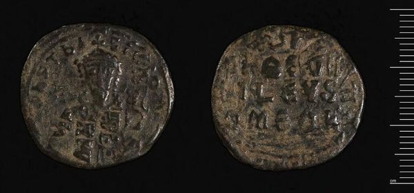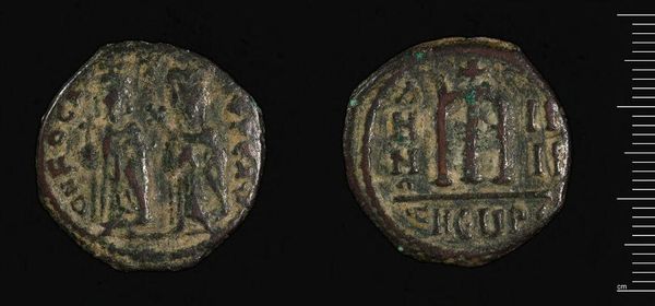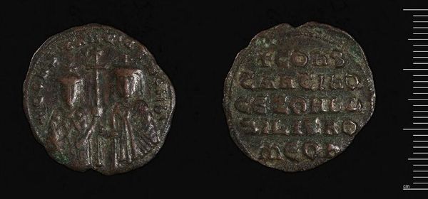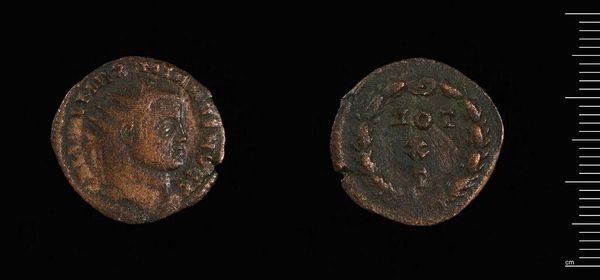 Editor: This is a coin of Damascus under Caracalla, currently residing at the Harvard Art Museums. The texture looks rough, and it appears quite small. How would you interpret the coin's visual elements? Curator: Note the coin's circular form, typical of its type. The obverse displays a portrait, the details obscured by wear, but the incised lines define its structure. The reverse presents a scene. Consider the formal arrangement; what shapes and lines structure this image? Editor: It seems the lines form an architectural design. Are the worn details significant? Curator: Precisely. The degradation, while obscuring clarity, provides a patina that enhances its texture. The coin's value lies in its formal composition and material presence. Its aesthetic impact persists regardless of its condition. What have you observed about its composition and materiality? Editor: I appreciate that you've focused on the inherent qualities and how its physical presence affects meaning. Thanks! Curator: My pleasure! Analyzing visual elements is key.