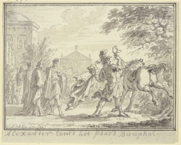 Simon Fokke created this drawing of Alexander Weeping for Darius, date unknown, using ink and wash. The composition invites us to examine the contrast between the quiet grief in the foreground and the implied dynamism of battle in the distance. Fokke uses a monochromatic palette of ink washes to create depth and mood. Notice how the concentration of ink defines the figures and intensifies our emotional engagement. The landscape isn't merely background; it merges with the figures to emphasize the solemnity and timelessness of the scene. The linear structure of the artwork guides our eyes across the page. The sparse use of hatching and contouring around the figures brings them to life while also creating an emotional distance. This piece explores the paradoxical nature of power, conquest, and compassion through the lens of classical history. Ultimately, Fokke asks us to confront the uncomfortable intersections between triumph and tragedy, solidifying the artwork’s place within both artistic and philosophical discourse.