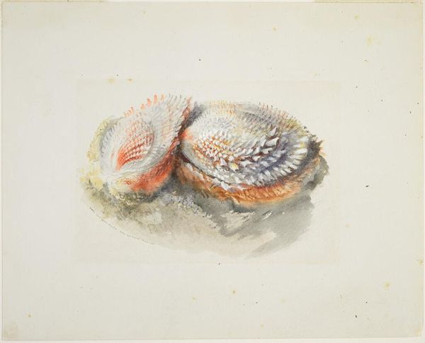 Curator: This is "Sea Shells" by Martin Mower, currently residing in the Harvard Art Museums. It measures about 12 by 19 centimeters. Editor: It's quite delicate, almost ethereal. The light seems to be both illuminating and softening the forms. Curator: Indeed. Note the precise graphite border, defining the picture plane. It almost acts as a stage for these natural objects. Mower's interest seems to be in the formal arrangement of shapes and textures. Editor: I wonder if the shells hold a particular cultural significance, perhaps linked to trade, exploration, or even early scientific illustration? Such detailed renderings often served a purpose beyond mere aesthetics. Curator: That's plausible, though the artist seems more interested in the interplay of light and shadow, and the subtle gradations of color across the shells’ surfaces. Editor: Regardless, it's a fascinating glimpse into a historical perspective on the natural world. Curator: Agreed, a study in form that invites contemplation of the fundamental elements of art itself.