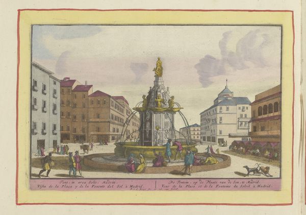 Curator: What strikes you first about this scene? For me, it’s the muted palette—almost ghostly. Editor: Indeed, there's a certain ethereal quality. I suppose the muted colors lend a calmness to what is, in fact, a bustling market scene. It makes me think about civic pride and commerce. Curator: Precisely. We’re looking at “View of the Wine Market in Augsburg” by Georg Balthasar Probst. The work, dating from between 1742 and 1801, is created using a combination of watercolors and mixed media. Editor: The buildings themselves appear incredibly detailed. The artist captured the textures and forms impeccably with very tight, neat brushwork. The precise geometry almost looks like an architect's drawing rather than a painting. The vanishing point is so pronounced, the whole vista pulls the eye in and along the market. I feel that contributes to the feel of an ordered, powerful society. Curator: The perspective absolutely directs our gaze. It creates a theatrical backdrop for the market's activity. The use of watercolor grants a delicate atmospheric feel which juxtaposes interestingly with the very solid and structured architecture that surrounds. There is a rigid architectural structure contrasting with the almost incidental addition of the figures. Editor: It’s certainly intriguing to consider the public’s role in its creation and reception. It clearly depicts civic life during a transformative period, presenting the market as a stage for the rituals of daily commerce. We should recall this area's commercial function throughout the depicted era in understanding the work. Curator: Perhaps these figures aren’t as incidental as I first believed. I think that through colour and form Probst invites the viewer to consider how society is constructed from both a planned structure and more informal public behaviours and practices. It suggests the potential, through repeated viewing, for more considered insights into Augsberg at the time of its creation. Editor: The overall presentation evokes that era’s confidence in city life. The architecture dwarfs all other details, representing power and purpose. It serves to reveal much about how life must have been at that point in time. I found looking at the architecture incredibly telling about the power structures within society. Curator: The contrast is indeed significant, pointing us towards key issues of power and society. And a close consideration of those formal techniques unlocks it all. Editor: Yes, looking back, it's incredible what an analysis of both form and cultural content reveals.