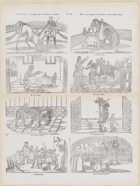 B. Fröhlich's print, *Janklaassen's groote menagerie*, presents a series of caged animals and figures, likely created in the Netherlands during a period of colonial expansion. The artwork invites reflection on themes of captivity, exoticism, and the power dynamics inherent in the display of the 'other'. The menagerie, a popular form of entertainment in the 19th century, symbolizes humanity's attempt to dominate the natural world. Here, animals like the lion and giraffe, alongside human figures are placed behind bars, evoking a sense of exploitation. The inclusion of colonized people as part of the spectacle highlights the dehumanizing aspects of imperialism. To fully grasp the meaning of this print, we must examine its cultural and historical context, researching sources on Dutch colonialism, the history of zoos and menageries, and the representation of non-European peoples in popular culture. By delving deeper into these areas, we can better understand the complex social dynamics reflected in this fascinating artwork.