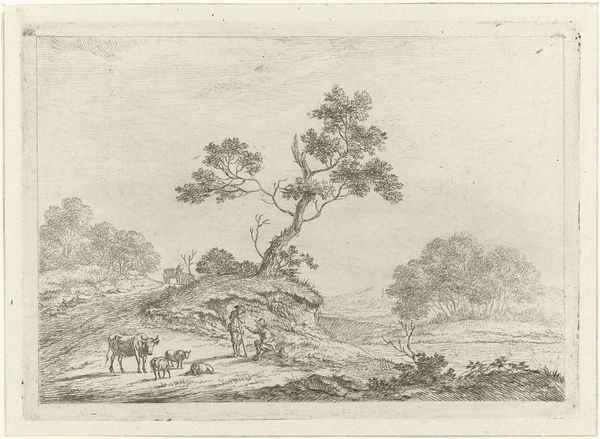 Curator: Let's delve into this piece, "Landschap met ruiter en voetganger," or "Landscape with Rider and Pedestrian," created sometime between 1781 and 1822 by Hermanus Fock. It's currently held at the Rijksmuseum, and what immediately strikes me is its layered nature. Artist: My first impression? Ethereal melancholy. That sounds heavy, but it feels light at the same time, wispy like a faded dream. The muted colours evoke a sense of stillness. You could almost feel the silence of the scene, right? Curator: Absolutely. Looking closer, you can appreciate how the mixed media—pencil, watercolor, colored pencil—captures a romantic ideal, where individuals traverse land almost allegorically. It brings questions of ownership to the forefront. Who has the right to traverse this landscape, and how are those rights being defined? This period saw an increase in enclosures and land privatization, affecting how people moved. Artist: Enclosures… Right, it almost feels like this piece longs for something else, the colors are quite desaturated almost ghostly; this reminds me of a sepia toned photo, maybe like when someone wants to make a place or person feel missed or nostalgic. The light is soft but it creates definition. You can clearly make out all of the details in the nature, from blades of grass to puffs of the trees above them. And yet with the riders and walkers being much smaller. This can also touch upon the idea that mother nature herself holds dominance over us all, like it overpowers human stature. It can go much further by saying, there's not much of a distinction between one blade of grass from another, like us being small and tiny characters playing bit parts. Curator: Precisely. These landscapes weren't simply pretty scenes; they reflected complex social dynamics. Who commissions these pieces and what are the power structures that are associated within that? And considering this artist made a sketch *en plein air*, capturing it this way gives another insight to it's political messaging Artist: It's amazing how much history we can read into such a quiet little sketch. All of these questions we have… what were we talking about? I’m already lost in this melancholic world again! It invites you to pause. It holds stillness and melancholy, the air… it must smell musty. You can sense this story here for the artist's sake to keep safe. It just stays that way; unforgotten for as long as that can be. Curator: Ultimately, "Landschap met ruiter en voetganger" reveals how landscape art can serve as a poignant reflection of its socio-political landscape. A testament to how deeply art can intertwine with broader social issues. Artist: Absolutely. From ghostly trees to faint riders, this sketch reminds me that even the quietest images can speak volumes.