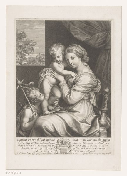 Editor: Here we have "Maria met het Christuskind en Johannes," dating somewhere between 1661 and 1704, by Guillaume Vallet. It looks like an engraving on aged paper. I find the composition quite classical, almost stoic in its stillness. What stands out to you as you look at this piece? Curator: Immediately, I’m drawn to the material conditions of its creation. We see an emphasis on line and the craft of engraving. Consider the engraver, likely working within a workshop setting, replicating and disseminating religious imagery for a specific market. Who commissioned this piece? Where was it sold? These questions speak to the broader social context. Editor: So you see the artistic skill involved in making this engraving but you wonder if it might be considered more of a printed reproduction destined to popular devotion? Curator: Exactly. Let's not forget the paper itself – the "aged paper," as you called it. What type of paper was it? Was it locally sourced? Its quality, its texture - all hint at the intended audience and its price point. These details connect the image to trade networks and the consumption habits of the time. Editor: That makes me wonder how much the material used dictated the overall look, and maybe even the value people assigned to the piece. How does this kind of perspective challenge our ideas of what is "high art?" Curator: By focusing on process, labor, and consumption, we move beyond simply appreciating the image and dive into the network of individuals involved in creating it. It asks us to consider the conditions of artistic production, pushing past the idea of a singular, inspired genius. Editor: This gives me so much to think about. It's not just the finished image, it’s about understanding art as a form of production within its time. Curator: Precisely! And hopefully that sheds some new light on this "still" image.