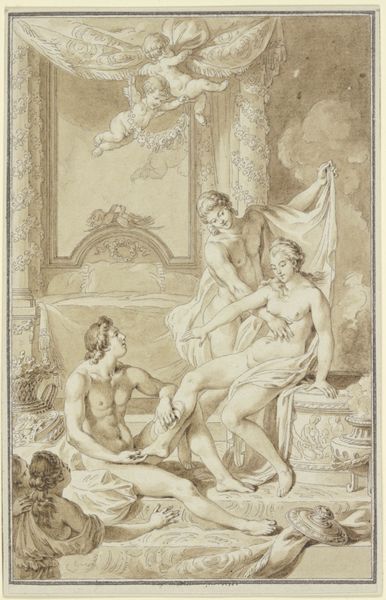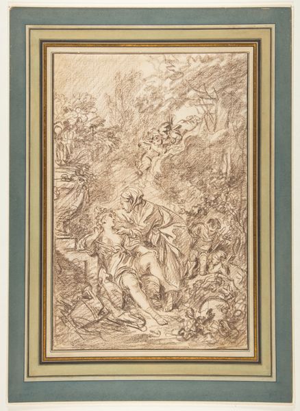 Francois Boucher created this drawing, "Venus Commanding Vulcan to Make Arms for Aeneas," using chalk and graphite. The monochromatic palette emphasizes form, guiding our eyes through a composition of soft lines and subtle gradations. Boucher masterfully uses the sepia tones to unite celestial and terrestrial realms. Note how Venus and Vulcan, though central, are integrated into the swirling clouds and billowing drapery through the tonal harmony. This creates a sense of unity and flow across the composition. The scene's dynamism is not just in its narrative but also in its structural organization. The diagonal arrangement, from Venus descending on her chariot to Vulcan toiling at his forge, infuses the drawing with movement. The consistent tonality allows for a reading of forms that destabilizes traditional hierarchies, suggesting a continuous interplay between divine command and earthly creation.