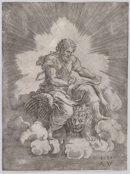 Agostino Veneziano created this engraving of Saint Matthew in the early 16th century, now held at the Metropolitan Museum of Art. The composition is dominated by the figure of Saint Matthew, robust and draped, accompanied by an angel, both seated on voluminous clouds. An intense burst of light emanates from above, accentuating the scene's divine nature. Consider how Veneziano employs line and texture to articulate form and space. Notice the fine, dense lines that define the figures and the cloud formations, creating a tactile sense of volume. The lines not only describe shape but also construct a semiotic system, where light and shadow represent divine presence and earthly form. The contrast between the solid, grounded figure of Matthew and the ethereal quality of the clouds and light destabilizes the boundary between the sacred and the tangible. The work invites us to consider how visual elements contribute to meaning. The sharp lines and stark contrasts are not merely descriptive, but engage with broader philosophical inquiries into perception, representation, and the very nature of belief. It challenges any fixed interpretation, encouraging a continuous process of re-evaluation.