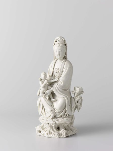 This is a porcelain figure of Guanyin Crossing the Sea, sculpted by He Chaozong, renowned for his Buddhist figures. Consider the cultural and historical context of He Chaozong's era. The rise in popularity of figures such as this one reflects the increasing integration of Buddhist beliefs into the daily lives of the population. This piece embodies a period of cultural exchange and religious syncretism. Guanyin, often seen as a symbol of compassion and mercy, is depicted here in flowing robes, standing on a base of swirling waves, a visual representation of her transcendence over earthly suffering. The smooth, white porcelain enhances the serene quality and purity associated with Guanyin, emphasizing her role as a divine being. Chaozong’s representation softens the traditional, more masculine depictions of Buddhist figures. Through both material and form, Guanyin Crossing the Sea invites contemplation on themes of salvation, empathy, and cultural harmony, reflecting the human desire for peace amidst life's tumultuous waves.