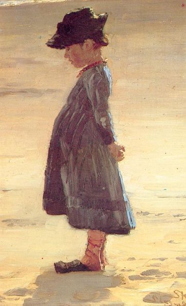John Singer Sargent made this oil sketch, ‘Girl on the Beach’, as a preparatory study for his painting, ‘Oyster Gatherers of Cancale’. The final painting shows a group of peasant women working under the vast open sky of the French coast, but here the focus is on a single figure. Sargent was part of a movement of artists who sought to capture the lives of ordinary people, especially those working in rural settings. In France, the Republican government was keen to promote art that depicted the nation’s landscape and its people, and Sargent was aligned with this cultural project. Sargent made his sketch with loose brushstrokes, emphasizing the rough textures of the beach and the girl’s clothing. Her stance conveys a sense of fatigue, of manual labor. By depicting the working classes, Sargent contributed to a broader artistic conversation about social identity in late 19th-century France. To understand this work more fully, we might look at other paintings of the same era and study the writings of art critics at the time, considering the changing role of art in French society.