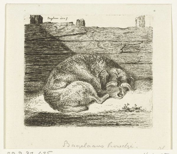 Editor: This is "Liggende hond naar links," or "Reclining Dog to the Left," a pencil drawing by Christiaan Wilhelmus Moorrees, dating somewhere between 1811 and 1867. I'm immediately struck by the dog's weariness, its pose communicates a sense of exhaustion or perhaps even resignation. What do you see in this piece? Curator: Beyond the dog's immediate state, I'm drawn to consider its potential symbolism within the broader social context of the 19th century. The depiction of domestic animals often served as allegories for human experiences and societal structures. Was Moorrees, perhaps, using the image of a tired, resting dog to reflect upon the laboring classes, or perhaps the burdens faced by women in that era? Consider the class system: where might the dog fit into a social hierarchy? Editor: That's a compelling angle! I hadn't considered the class implications. I was focusing so much on the individual animal. I was just taking it at face value. Curator: Right, but nothing exists in a vacuum. Moorrees, as an artist, was undeniably influenced by his surroundings, and art is so often an unintentional time capsule of history, so we can use what we know of his circumstances and ours to reflect. What is the dog resting against? And who is to say what we imagine for the bricks versus the dog's reality at the time it was sketched? Is there any implicit connection or lack thereof? Editor: I see. It looks like a brick wall and some foliage is visible on top, sketched more roughly, but are possibly ivy. Perhaps the dog is a "street" dog taking refuge. Thinking about it now, that feels like a comment on displacement and urban life in that time. Curator: Precisely! Now, how might you interpret this work through a lens of, say, eco-feminism, where relationships between women and nature intersect with concerns about environmental destruction and social justice? The “master’s tools” can dismantle any system. Editor: This has been really helpful. I’m walking away with a better understanding of the socio-political messages we can discover from just one single drawing. I’m starting to see that context truly is key!