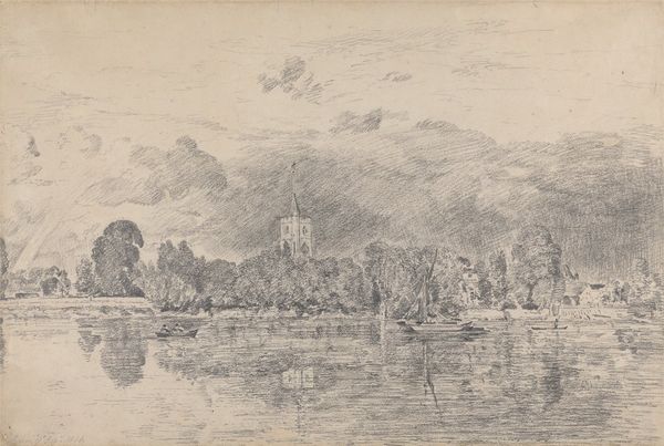 Curator: Let's take a look at "Eton from the Thames," a watercolor attributed to David Cox, likely created in the early 19th century. It offers a hazy view across the water towards the iconic buildings of Eton College. Editor: Ah, the watercolor is quite dreamy, isn’t it? It’s all soft edges and muted tones, like a half-remembered summer afternoon from a boat. A very idealized English landscape, wouldn’t you say? Curator: Yes, there's definitely a sense of idyllic tranquility. The scene invokes the visual tropes of Romanticism, celebrating the picturesque beauty of the natural landscape as a stage for architectural splendor. The hazy, diffused light creates a certain mood. Editor: That light is interesting, isn’t it? I find the piece evocative of transition… not merely time of day but maybe, too, cultural shift. Notice the buildings – signs of the new – standing next to the landscape with the flocks of birds, remnants of something far older. What might they suggest together? Curator: Eton College is definitely imbued with very specific connotations. As an institution, it stands as a powerful emblem of English heritage and social order. And those birds overhead, en masse, introduce freedom in contrast to the rather fixed social and architectural setting of Eton. David Cox understood his semiotics. Editor: So, do you think Cox consciously injected all this loaded symbolism? Or, was he merely interested in capturing the scene? My suspicion? A bit of both, intentionally and accidentally. I reckon art often has secret intentions! The reflection of the structures on the water adds another dimension too—dreamlike doubles or inverted social realities. Curator: I think you've made a valuable point about the potential subconscious intention. The reflections in the Thames certainly amplify the scene’s symbolic potency. They reinforce that visual dialectic between established tradition and fleeting reality that runs throughout. Editor: Makes you want to grab a punt, a sketchbook, and argue about art, eh? This scene has stirred my senses beyond expectation; that quiet surface hides depths that linger. Thanks for the little boat trip. Curator: Likewise! It’s amazing how even a fleeting watercolour can contain a rich store of cultural and artistic significance if we take the time to explore it.